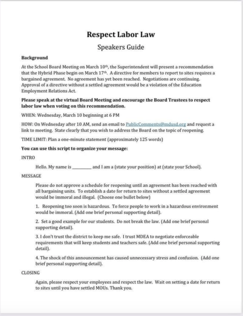 Instead it appears that MDEA is ignoring the opportunity to garner community support for a safe reopening and choosing to appear intractable and unreasonable. When I read the talking points memo that MDEA has distributed to teachers as a guideline for public comment at the Board meeting, it seems incredibly out of touch with the very real concerns of so many families in this area. There is zero indication of a commitment to reach a MOU in the near future. It also fails to acknowledge the teachers who are eager to return to the classroom and want to do their part in a safe reopening.