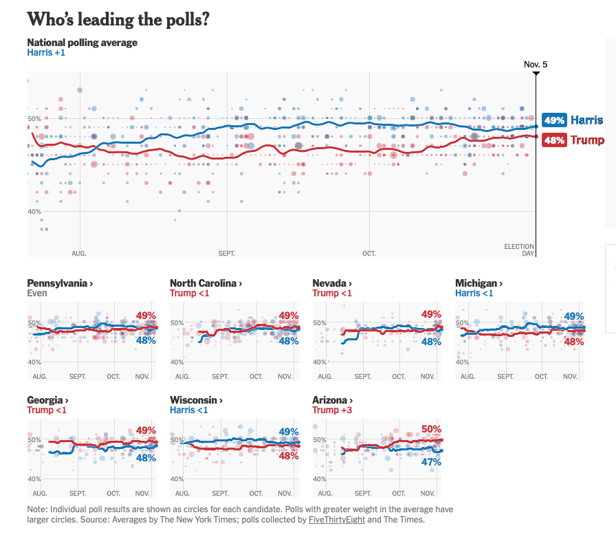 No time like Election Day to dust off the blog and come out with some thoughts. Going into the day, Kamala is in a strong position to win. Polls were capturing movement towards Trump the last few weeks, but that has been reversed in the closing week.