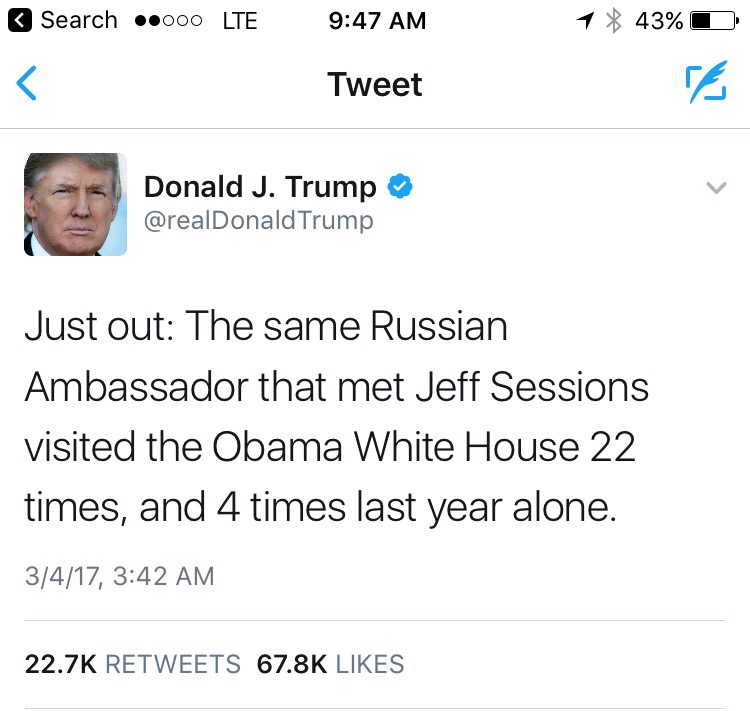 If there is one thing we have learned it is that just because it is the weekend it doesn’t mean President Trump is going to stop tweeting nonsense. Without citing any evidence, Trump is accusing Obama of having tapped his phone during the election. Trump classily calls his predecessor a “Bad (or sick) guy!” …..No word if the tapped phone transcripts will be translated or in the original Russian.
